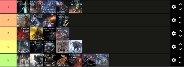 Soul of Cinder: the merely reason this is a B tier is considering of the luck I had with this boss, I went in with no cognition of the boss or what to do and what his attacks were, but manage to trounce him starting time endeavour without estus and running on 300 hp, his attacks were fast and tough only wasn't a large deal merely for that.